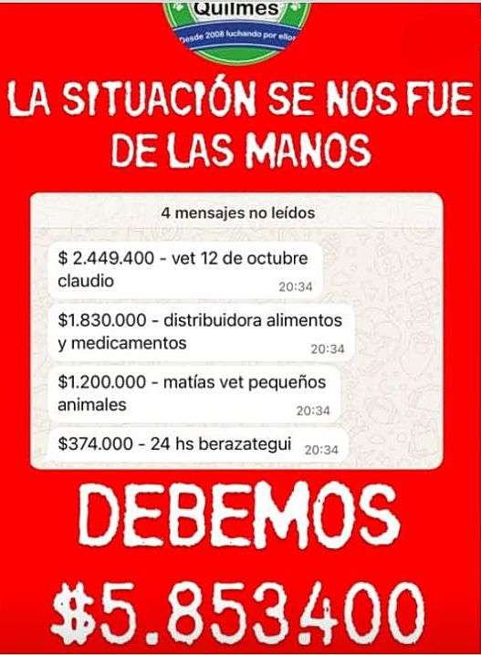 La agrupación Adopciones Quilmes, que desde 2008 trabaja en el rescate y cuidado de perros y gatos abandonados, atraviesa una situación económica límite. A través de sus redes sociales, informaron que actualmente deben $5.853.400 en concepto de atención veterinaria, alimentos y medicamentos, y lanzaron una campaña urgente para poder saldar parte de la deuda.