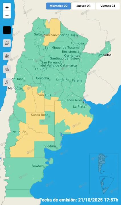 El SMN anticipó además valores de precipitación acumulada entre 30 y 70 milímetros, que podrían ser superados de manera puntual. Las lluvias más intensas se esperan entre la tarde del jueves 23 y el viernes 24, por lo que se recomienda tomar precauciones.