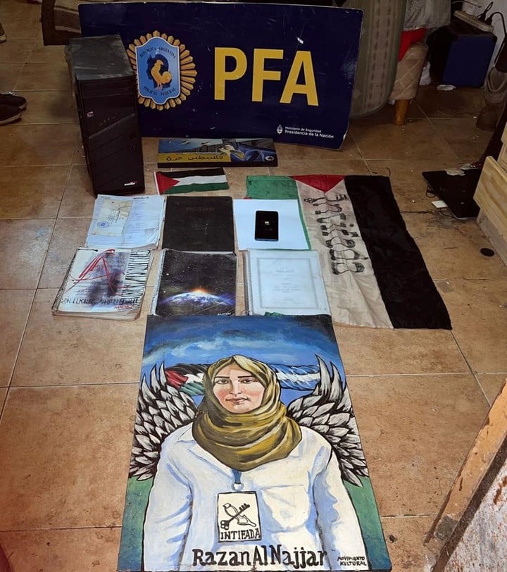 Se secuestraron un CPU, cuadernos con anotaciones en árabe, imágenes con banderas palestinas, y dos cuadros: uno de un dibujo con inscripción escrito en árabe (sería Palestina libre), y otro con con el dibujo de Razan Al Nakkar, una enfermera asesinada por un franco tirador en 2018.