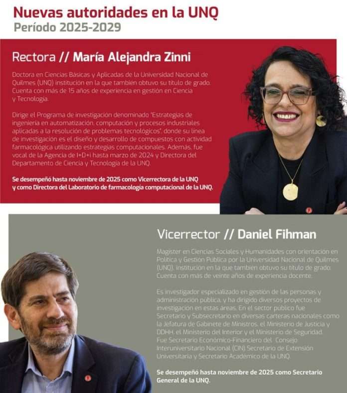 En una sesión extraordinaria realizada el lunes 20 de octubre, la Asamblea Universitaria de la Universidad Nacional de Quilmes (UNQ) eligió a María Alejandra Zinni como rectora y a Daniel Fihman como vicerrector, quienes asumirán sus cargos el 10 de diciembre de 2025.