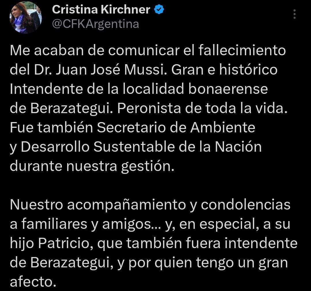 “Me acaban de comunicar el fallecimiento del Dr. Juan José Mussi. Gran e histórico intendente de la localidad bonaerense de Berazategui. Peronista de toda la vida. Fue también Secretario de Ambiente y Desarrollo Sustentable de la Nación durante nuestra gestión.”