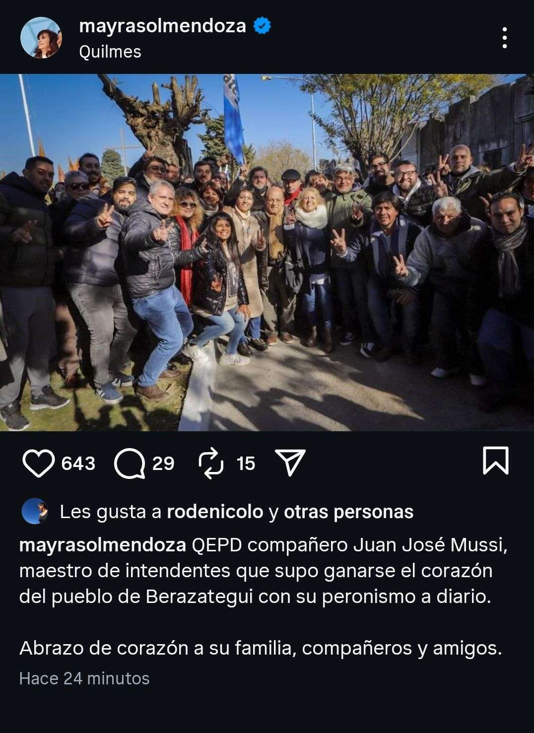 Desde Quilmes, la intendenta Mayra Mendoza también expresó su despedida y resaltó la figura política de Mussi:“QEPD compañero Juan José Mussi, maestro de intendentes que supo ganarse el corazón del pueblo de Berazategui con su peronismo a diario. Abrazo de corazón a su familia, compañeros y amigos.”