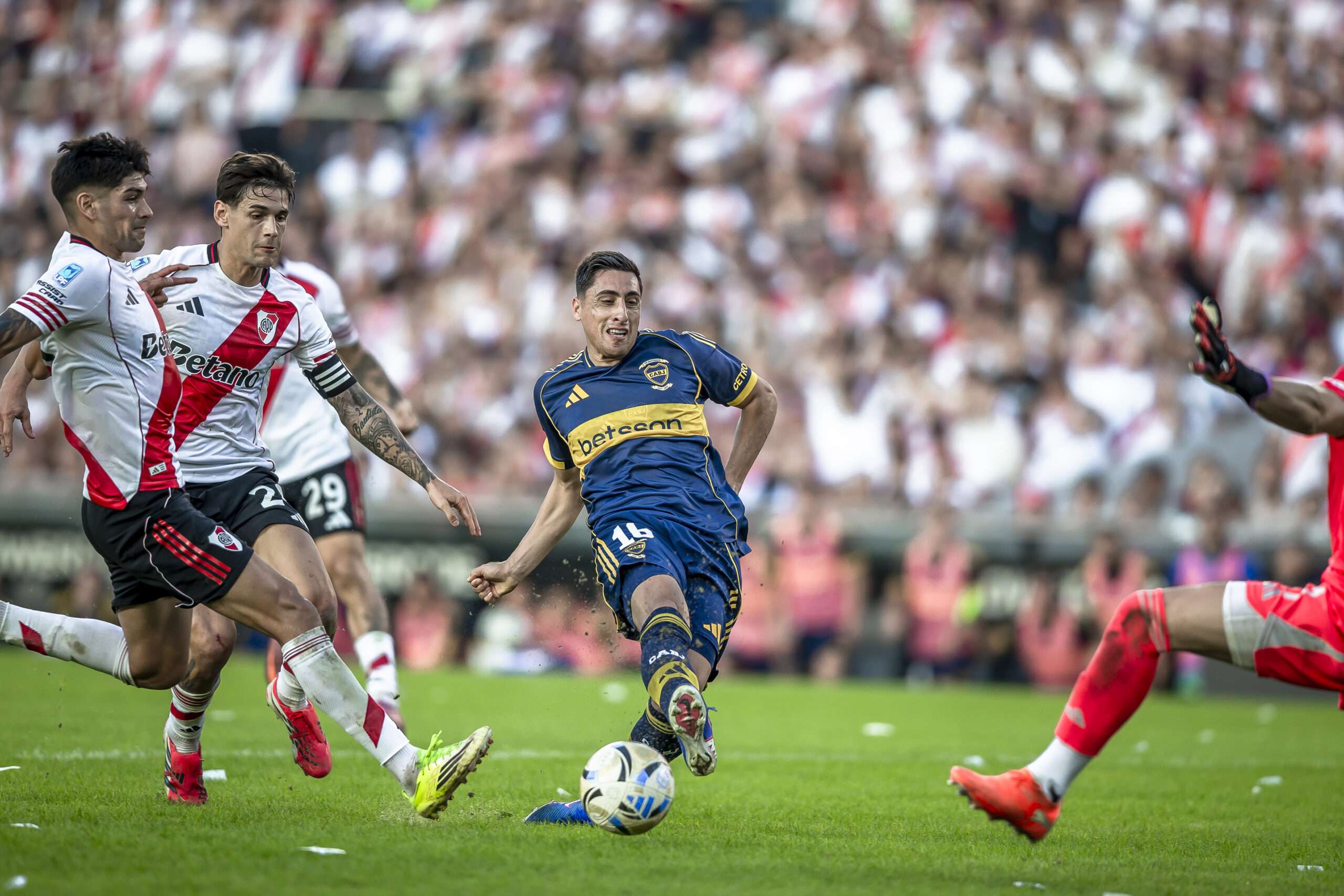 El arranque mostró a Boca más directo. A los 9 minutos, Paredes metió un pase largo quirúrgico para Miguel Merentiel, que no llegó a definir ante el cierre de la defensa local. River respondió a los 19 con un remate lejano de Juan Cruz Meza que se fue desviado.