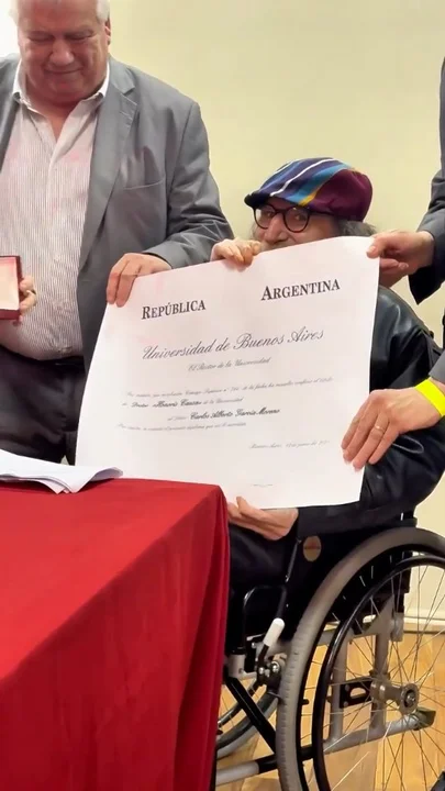 “Gracias a la Universidad por este reconocimiento tan importante, desde ahora pasaré a llamarme Doctor Charly García”, sostuvo el intérprete con un gesto en señal de los dedos en forma de “V”, antes de ser el foco de los flashes junto a su título.