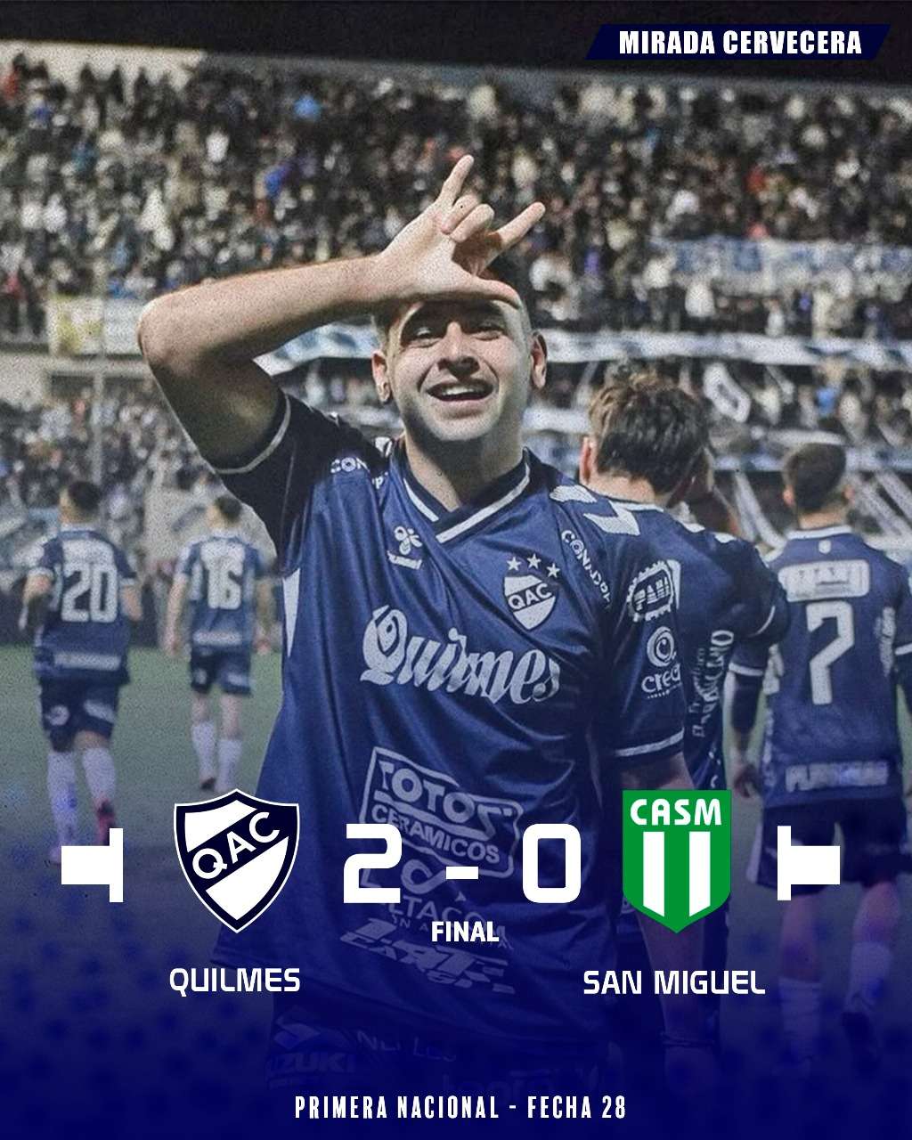 Quilmes derrotó como local a San Miguel por 2 a 0, en el inicio de la fecha 28 de la Primera Nacional, en un partido que se definió en tiempo de descuento y desató la euforia del Estadio Centenario.