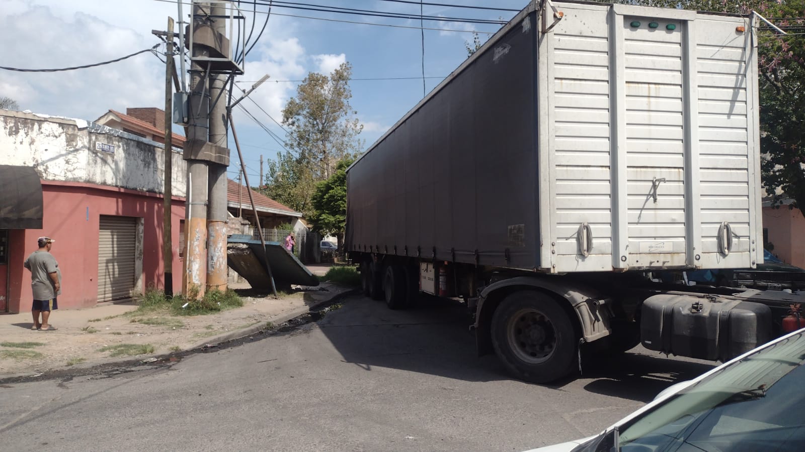 En el mediodía del miércoles, un camión con acoplado chocó y destruyó una parada de colectivo de cemento en la calle Mozart y Primera Junta al intentar doblar sin calcular el tamaño del acoplado.